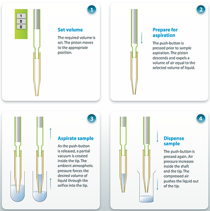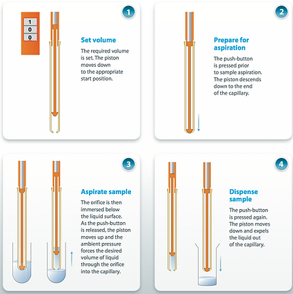 The schematic drawings show how the piston determines the volume of air displaced and subsequently the volume of sample aspirated.
